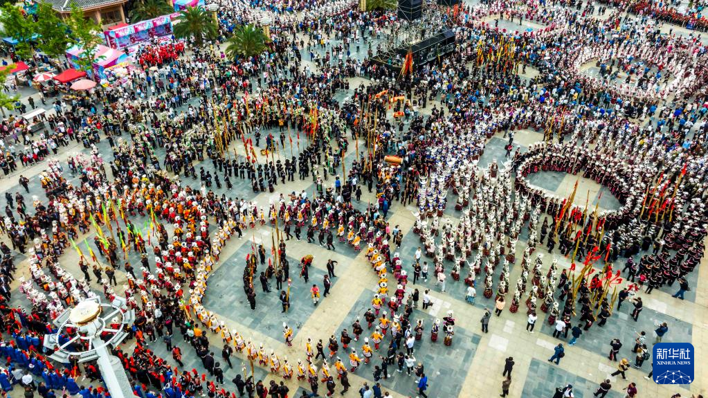 5月2日,人們在貴州省臺江縣姊妹廣場參加苗族姊妹節(jié)盛裝活動(無人機(jī)照片)。