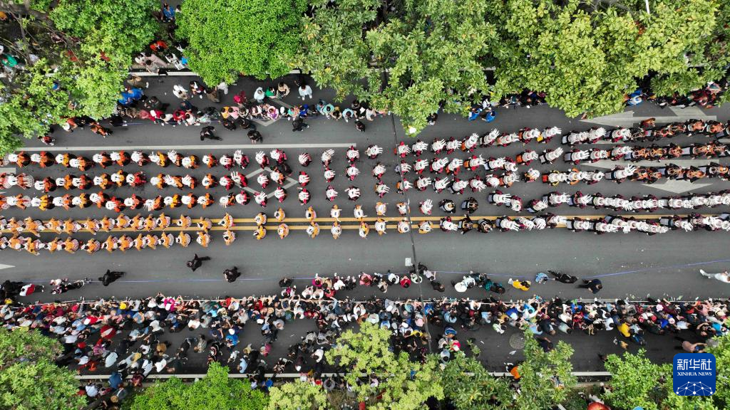 5月2日,人們在貴州省臺江縣參加苗族姊妹節(jié)盛裝巡游(無人機(jī)照片)。