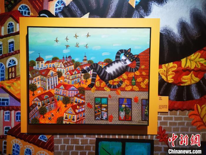 中新網(wǎng) 成都8月29日電(單鵬 程兆)“自從有了城市,屋頂就代替樹梢,成為了喵星人的新王位”。畫面中,一只黑灰色花紋的貓咪翹著二郎腿,悠閑地躺在屋頂,望著天空的飛鳥和白俄羅斯首都明斯克漂亮的建筑和街巷。這是四川博物院新展“尋喵啟事”藝術(shù)展中的一幅作品,充分展示了藝術(shù)家浪漫的想象力。
