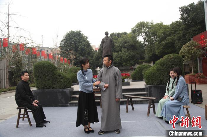 張瀾在教育子女時誕生了很多有意義的小故事,我們選取了其中幾個,編排成15分鐘的情景劇。情景劇這種形式,第一個優(yōu)點(diǎn)是時間短,游客來紀(jì)念館參觀——預(yù)計(jì)參觀1個小時吧,花15分鐘看這出劇,輕輕松松就能看完;第二個優(yōu)點(diǎn)是不占地方,我們一般在紀(jì)念館的銅像廣場演出,下雨的話就改到展廳里做室內(nèi)演出。我們這兒是古建筑,在里面演出是很有感覺的。