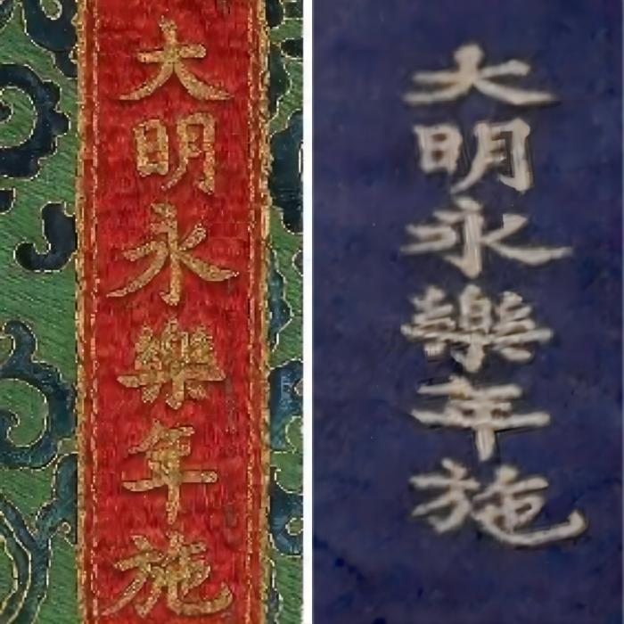 ▲“大明永樂年施”題款對(duì)比圖,左側(cè)綠底為永樂御制紅閻摩敵刺繡唐卡,右側(cè)藍(lán)底為明永樂勝樂金剛織錦唐卡。