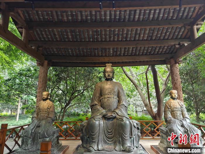 在四川博物院,“長(zhǎng)江之神”戶外常設(shè)展迎來大批觀眾?,F(xiàn)場(chǎng)立有明代江瀆神青銅像,鑄造工藝精美,青銅像身上的銘文記載了鑄造起因和有關(guān)江瀆祠建造的記錄。