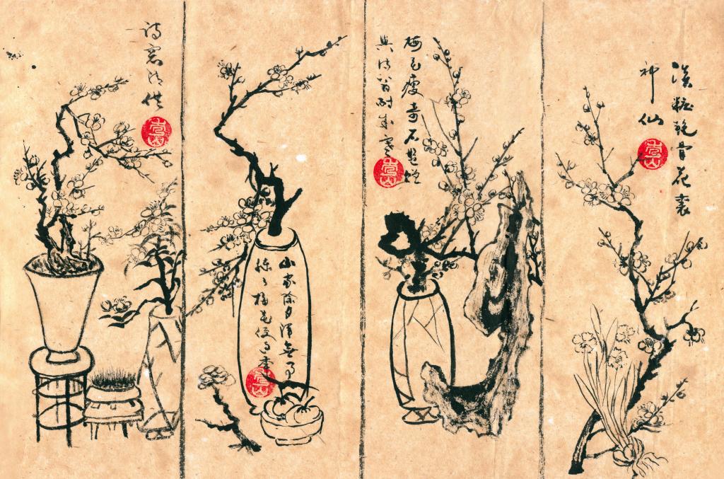 明代文震亨在其《長(zhǎng)物志》中有一段評(píng)述梅的文字:“幽人花伴,梅實(shí)專(zhuān)房。取苔護(hù)蘚封,枝稍古者,移植石巖或庭際,最古。另種數(shù)畝,花時(shí)坐臥其中,令神骨俱清,綠蕚更勝,紅梅差俗;更有虬枝屈曲,置盆盎中者,極竒。蠟梅磬口為上,荷花次之,九英最下,寒月庭際,亦不可無(wú)。”