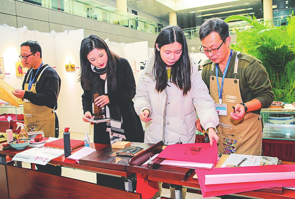 學(xué)生們現(xiàn)場學(xué)習(xí)制作木版年畫。