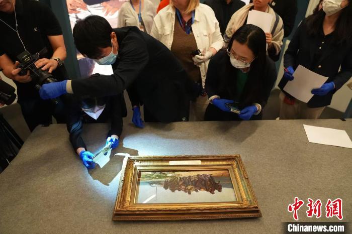 中俄兩國(guó)專家共同檢視剛開箱的《伏爾加河上的纖夫》油畫草圖。 史春陽 攝