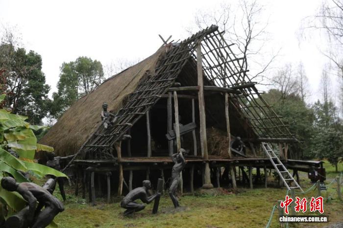 河姆渡遺址干欄式建筑復(fù)原圖(資料圖)。 (寧波市文化遺產(chǎn)管理研究院供圖)