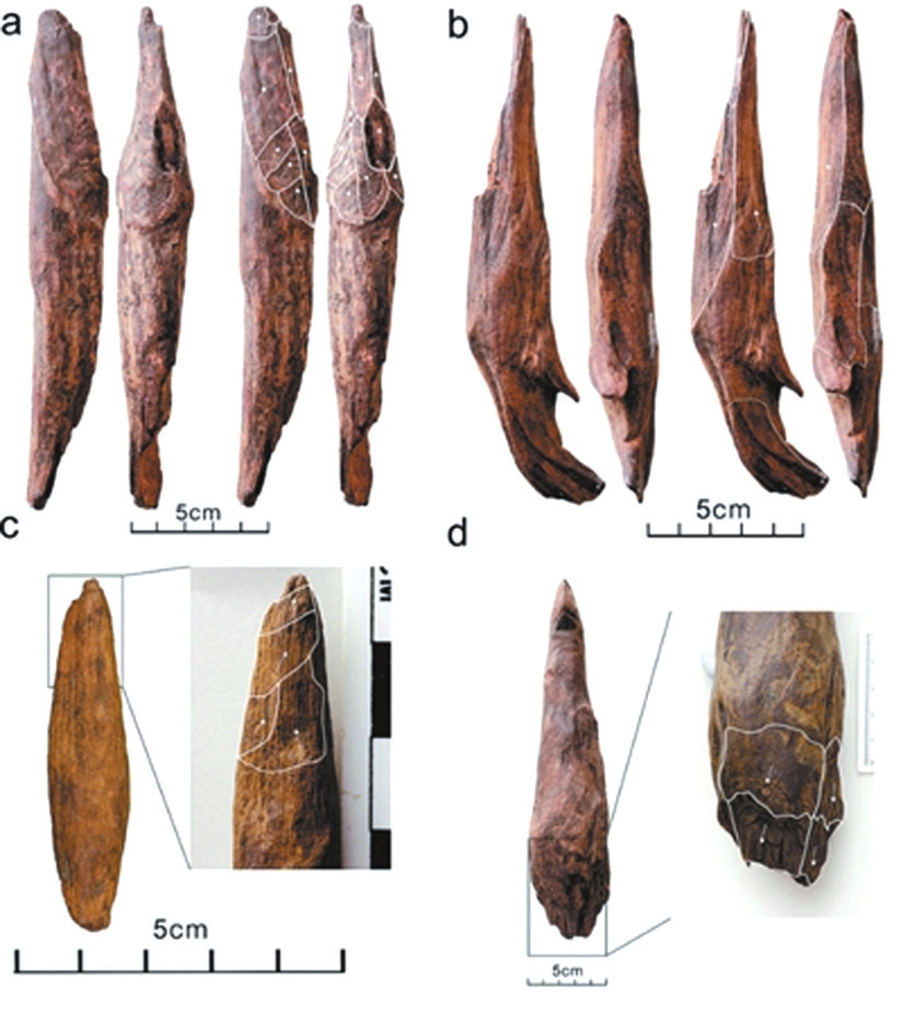 在沒(méi)有鎬、鏟等金屬工具的情況下,生活在甘棠箐遺址的古人群是如何將深埋于地下的可食性植物根塊挖掘出來(lái)并加以食用的?遺址出土的木質(zhì)材料給我們提供了答案:古人類制作和使用了木器。在該遺址發(fā)掘出土的近千件木質(zhì)材料中,35件被鑒定為人類加工的木器。這些木器主要用松樹(shù)制作,器身挺直光滑,一端或兩端被加工成尖狀,尖部形態(tài)包括鑿型、鏟型、錐型等。其中兩件是需雙手持握的大型挖掘棒,還有4件具有獨(dú)特的鉤狀尖刃,可用于切斷植物根系,其余則為可單手持握的小型挖掘工具。