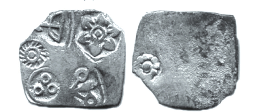 古印度摩揭陀國孔雀王朝時期的卡夏帕那銀幣,似乎可以為亞里士多德的說法提供佐證??ㄏ呐聊倾y幣的具體起源時間不詳,其名源自重量單位“卡夏”,形制為切割成型的銀片或銀塊,正面加蓋戳記作為價值標識,戳記數(shù)量通常為一個至六個不等。早期的卡夏帕那銀幣可能由民間或地方勢力發(fā)行,其價值除了依托銀材本身的重量與成色,很大程度上取決于加蓋戳記的發(fā)行人或認證人的信譽背書。