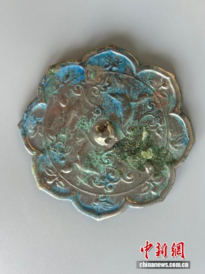 值得一提的是,在墓葬M7中出土的銅鏡十分精美。該銅鏡直徑11.2厘米,厚0.45厘米,鈕高0.4厘米,為八瓣菱花形,內(nèi)切圓形,圓鈕,鈕周邊飾鳥(niǎo)紋與花枝紋,緣內(nèi)蜜蜂、花葉相間排列。
