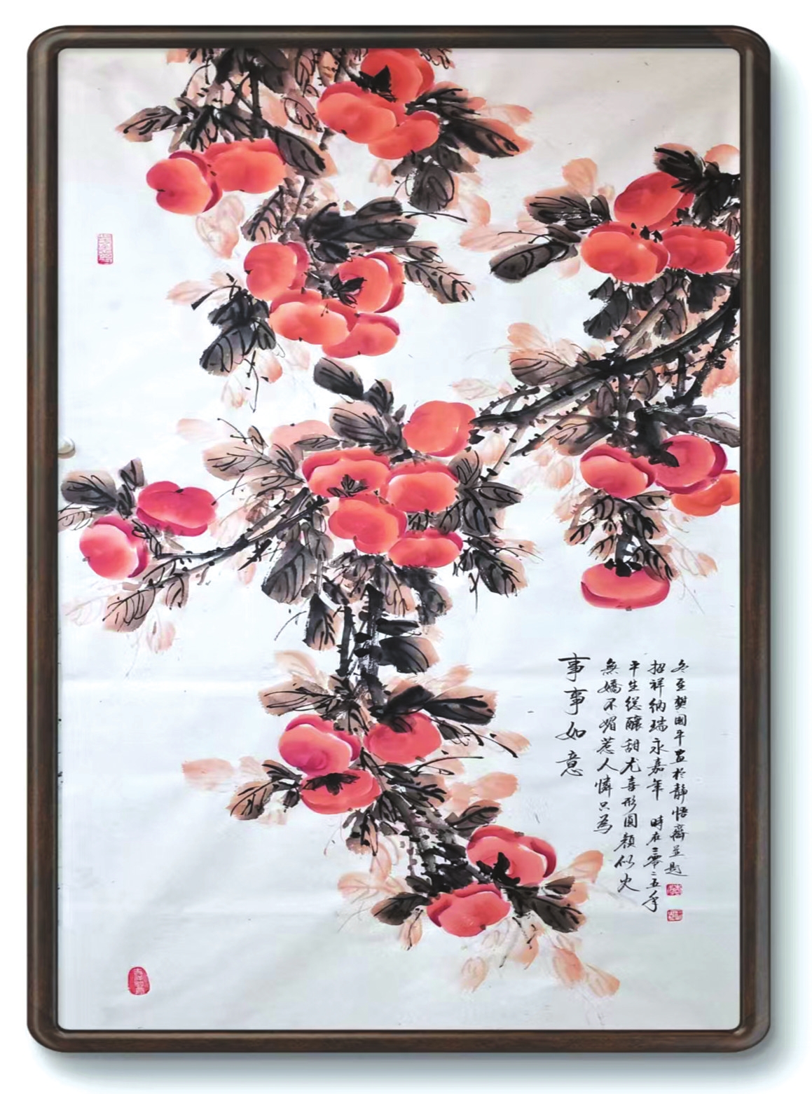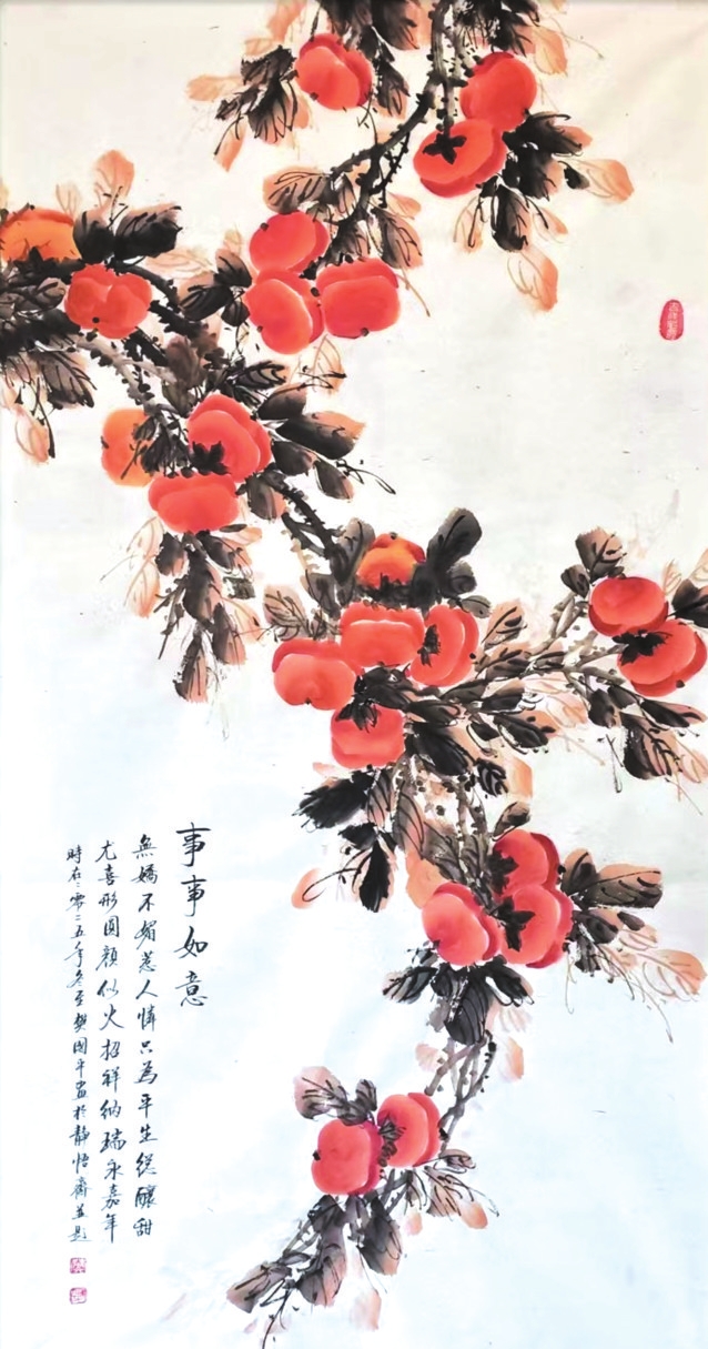 在樊國平眾多題材探索中,《事事如意》系列柿子圖可謂其藝術(shù)精神與人生哲思的縮影。這些作品超越了尋?;B畫的怡情悅性,成為她寄托情懷、叩問生命的重要載體。畫中那一串串、一簇簇丹柿,色澤溫潤(rùn),形態(tài)豐盈,承載著諧音“事事如意”的吉祥寓意,滿足了社會(huì)對(duì)美滿生活的樸素祈愿。她以此通俗意象為入口,引領(lǐng)觀者步入一個(gè)融匯儒、道、佛哲學(xué)理念的深邃境界,實(shí)踐著中國藝術(shù)“技進(jìn)乎道”“以畫載道”的至高追求。