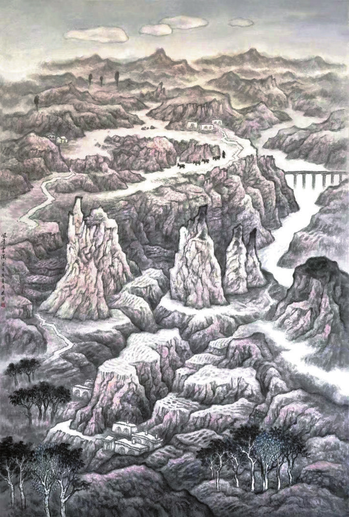 中國(guó)現(xiàn)代畫(huà)家、美術(shù)教育家徐悲鴻先生曾說(shuō):“道在日新,藝亦須日新,新者生機(jī)也,不新則死?!币馑际钦f(shuō),藝術(shù)需要不斷追求,不斷創(chuàng)新,才能永葆生命活力。科班出身的周建國(guó),躬耕國(guó)畫(huà)山水40余載,歷經(jīng)多年藝術(shù)實(shí)踐,在繼承傳統(tǒng)藝術(shù)精華的同時(shí),開(kāi)創(chuàng)了獨(dú)具特色的藝術(shù)語(yǔ)言,其作品不僅體現(xiàn)了扎實(shí)的繪畫(huà)功底,還展現(xiàn)出持之以恒的藝術(shù)探索精神。