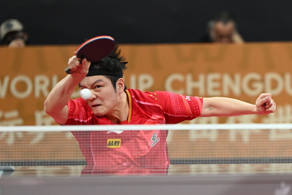 12月7日,中國隊(duì)選手樊振東在男單比賽中回球。新華社記者 胥冰潔 攝