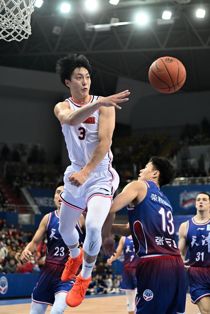12月11日,廣東隊球員胡明軒(上)在籃下傳球。新華社記者 孫凡越 攝