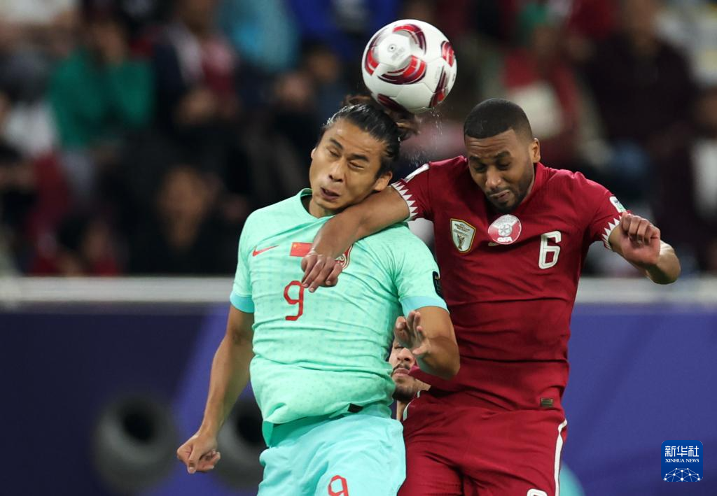 1月22日,中國(guó)隊(duì)球員張玉寧(左)與卡塔爾隊(duì)球員阿卜杜勒·哈特姆爭(zhēng)頂。新華社記者 曹燦 攝
