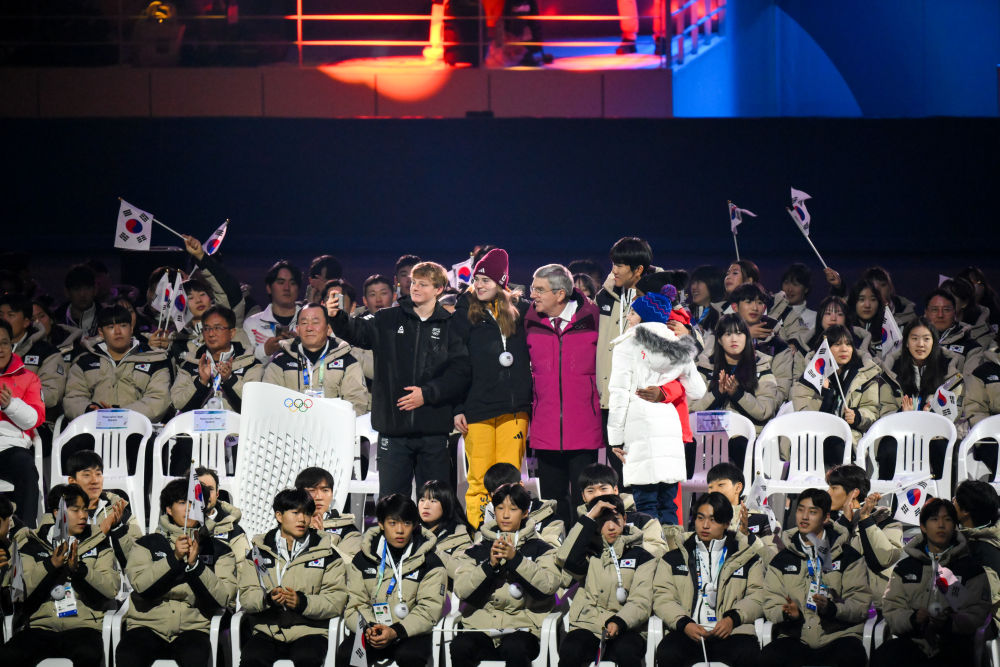 1月19日,國際奧委會主席巴赫在江陵速滑館開幕式現(xiàn)場與運動員合影。當(dāng)日,第四屆冬季青年奧林匹克運動會開幕式在韓國江原道江陵速滑館和平昌圓頂體育館同時舉行。新華社記者 朱煒 攝