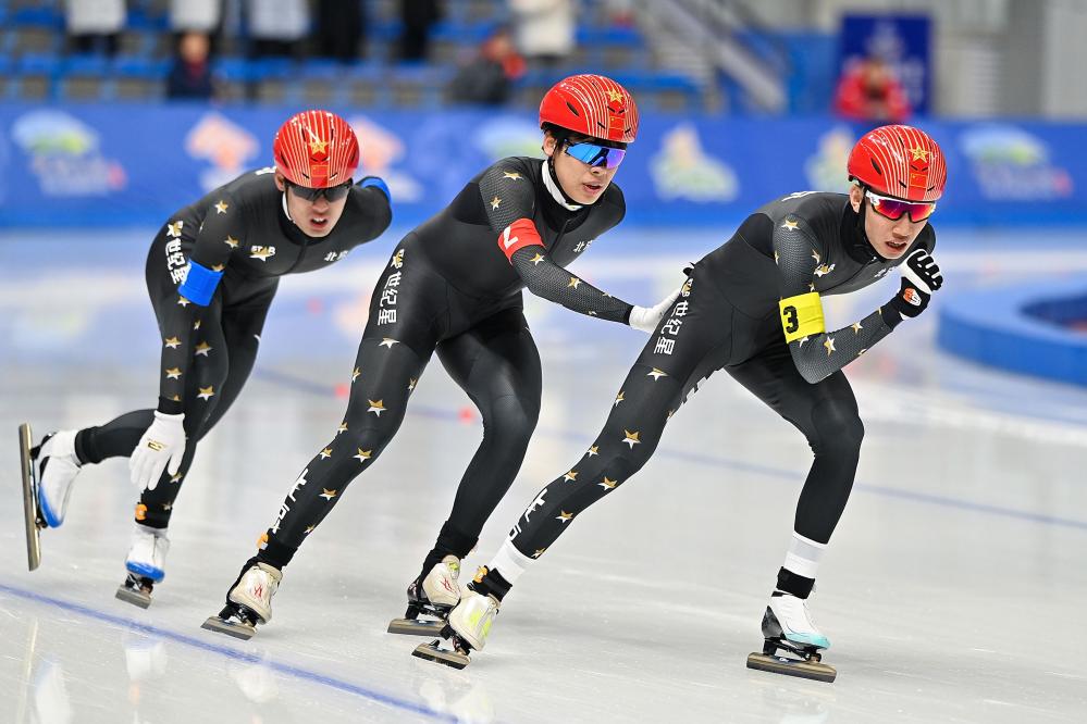 2月27日,四川隊選手王禹萱(右)、太智恩(中)和王藝敏在比賽中。新華社記者 楊晨光 攝 在速滑青年組女子團體追逐賽中,先是吉林隊以3分09秒52的成績打破該項目全國青年紀錄,河北隊和四川隊隨后又分別刷新了紀錄,最終四川隊力壓河北隊奪得冠軍,將該紀錄刷新為3分07秒46。四川隊隊員太智恩說:“為了這個比賽,我和隊友們準備了6年。” 男子團體追逐決賽是速滑青年組的最后一場比賽,北京隊以3分52秒69的成績摘得金牌,并打破該項目全國青年紀錄。