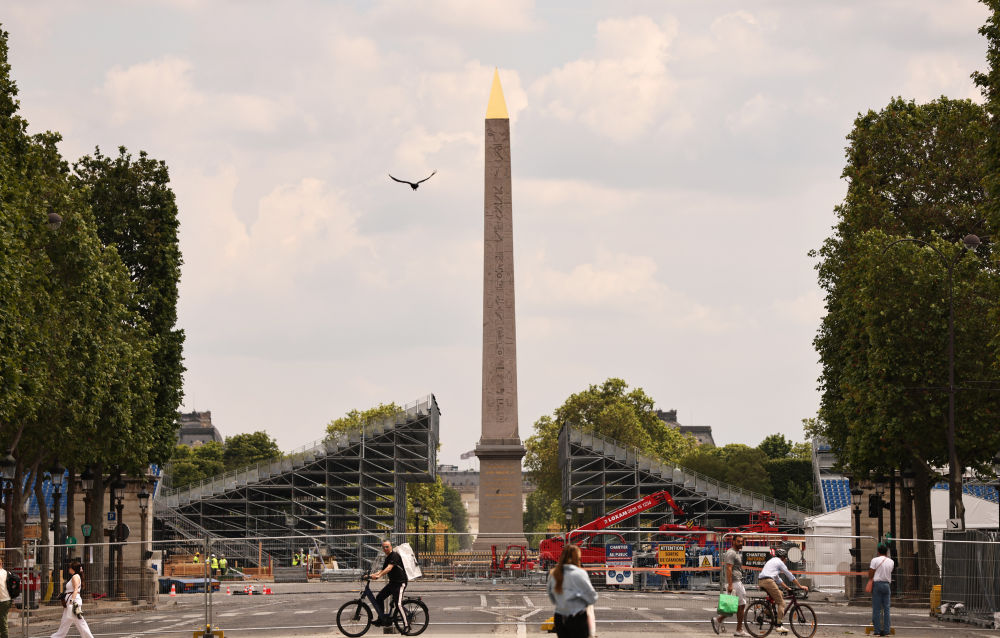 這是6月4日在位于法國巴黎市中心的協(xié)和廣場拍攝的臨時比賽場地搭建現(xiàn)場。新華社記者 高靜 攝