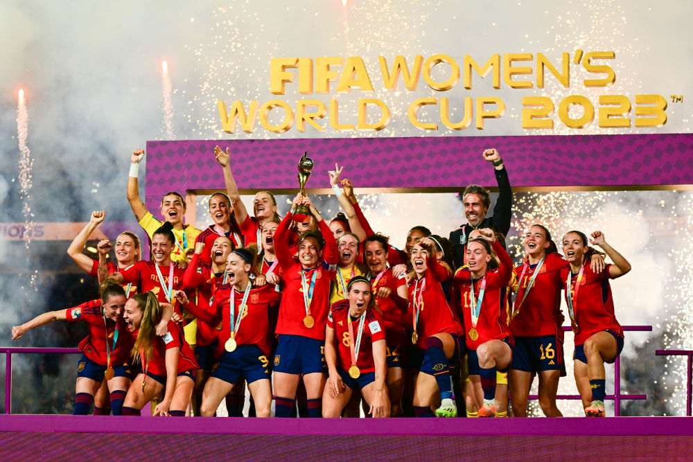 2023年8月20日,西班牙隊?wèi)c祝奪冠。當(dāng)日,在澳大利亞悉尼舉行的2023年國際足聯(lián)女足世界杯決賽中,西班牙隊1:0戰(zhàn)勝英格蘭隊,獲得冠軍。新華社記者 朱煒 攝