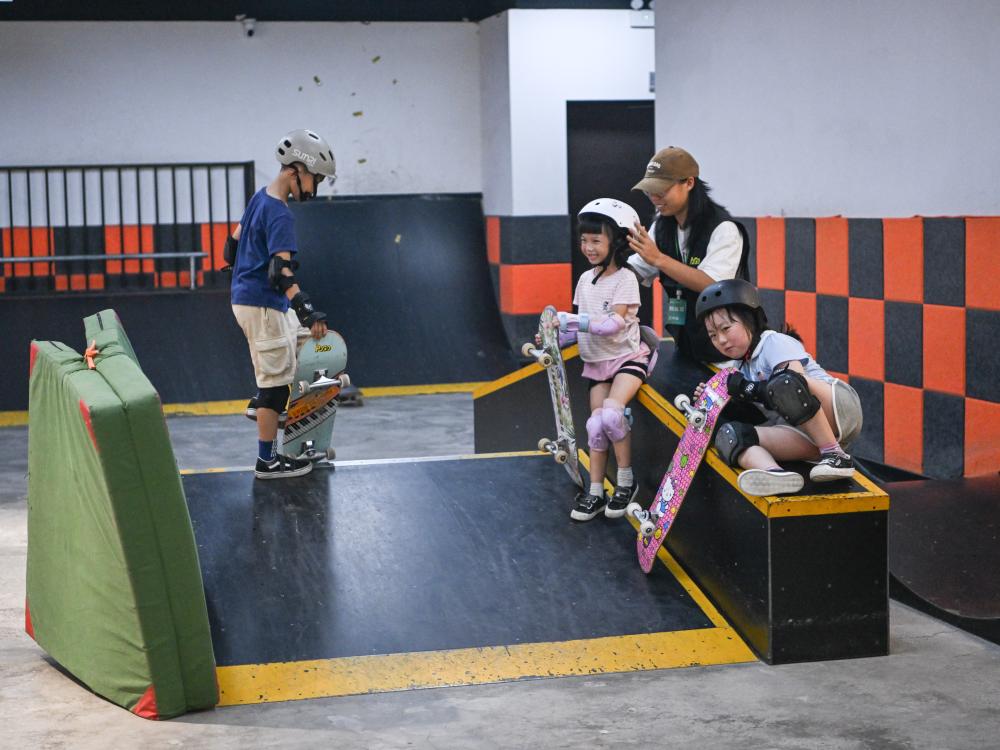 7月17日,閤靈暄(左二)正在進行滑板訓(xùn)練。新華社記者 王曦 攝