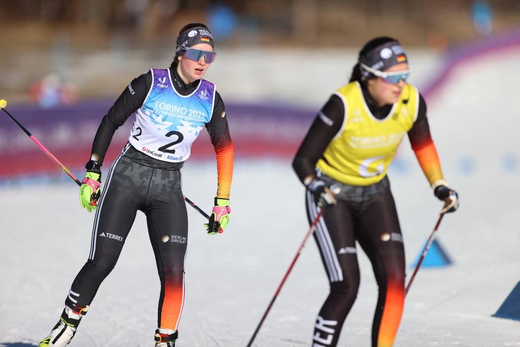 1月15日,德國選手約翰娜·雷克滕瓦爾德(左)和她的領滑員克里斯蒂安·克拉斯曼在2025年都靈大冬會越野滑雪女子10公里視障NS級比賽中。新華社記者 李京 攝