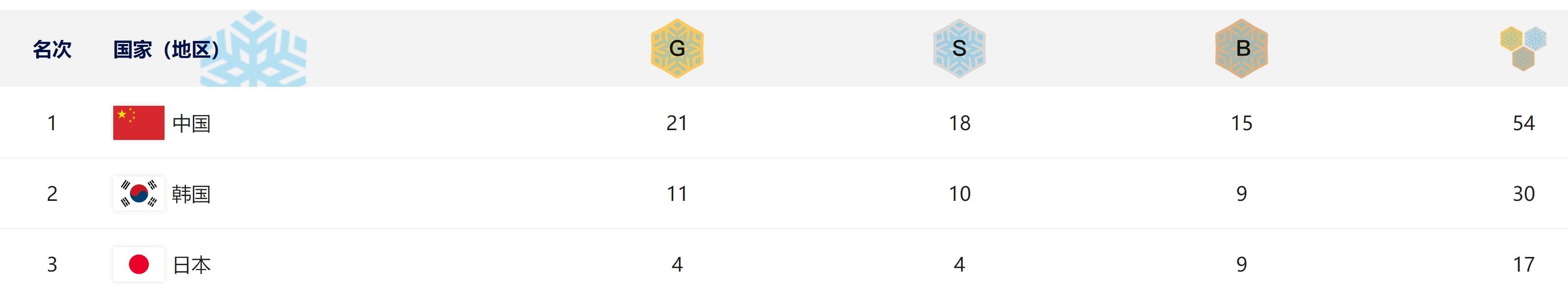 單日再奪6金,中國(guó)代表團(tuán)在本屆亞冬會(huì)已奪得21金18銀15銅,21金也創(chuàng)造了中國(guó)代表團(tuán)參加單屆亞冬會(huì)歷史最佳成績(jī)(此前為2007年長(zhǎng)春亞冬會(huì)的19金)。韓國(guó)隊(duì)目前以11金10銀9銅排名獎(jiǎng)牌榜第二,日本隊(duì)以4金4銀9銅排名第三。
