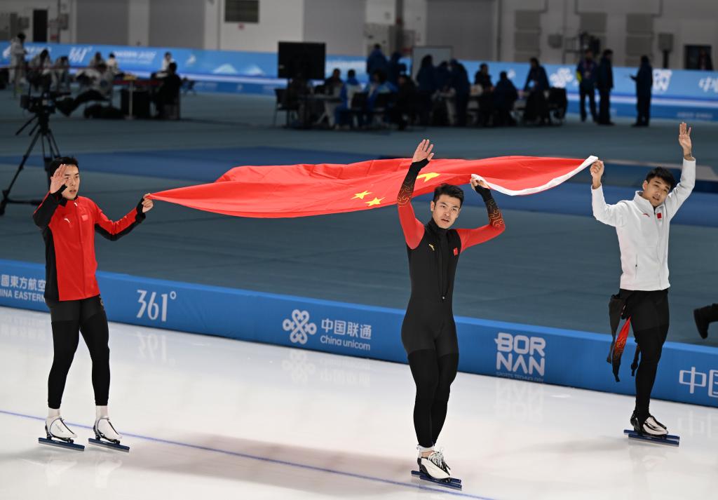 2月10日,中國(guó)隊(duì)選手高亭宇、寧忠?guī)r與廉子文(從右至左)慶祝奪冠。當(dāng)日,第九屆亞冬會(huì)速度滑冰男子短距離團(tuán)體追逐賽在哈爾濱舉行。中國(guó)隊(duì)獲得冠軍。新華社記者 趙子碩 攝