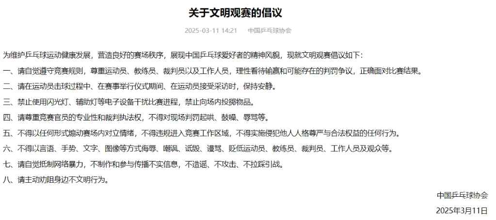 這八條倡議包括:請自覺遵守競賽規(guī)則,尊重運動員、教練員、裁判員以及工作人員,理性看待輸贏和可能存在的判罰爭議,正確面對比賽結果;請在運動員擊球過程中、在賽事舉行儀式期間、在運動員接受采訪時,保持安靜;禁止使用閃光燈、輔助燈等電子設備干擾比賽進程,禁止向場內投擲物品;請尊重競賽官員的專業(yè)性和裁判執(zhí)法權,不得對現(xiàn)場判罰起哄、鼓噪、辱罵等;不得以任何形式煽動賽場內對立情緒,不得違規(guī)進入競賽工作區(qū)域,不得實施侵犯他人人格尊嚴與合法權益的任何行為;不得以言語、手勢、文字、圖像等方式侮辱、嘲諷、詆毀、謾罵、貶低運動員、教練員、裁判員、工作人員及觀眾等;請自覺抵制網絡暴力,不制作和參與傳播不實信息,不造謠、不攻擊、不拉踩引戰(zhàn);請主動勸阻身邊不文明行為。