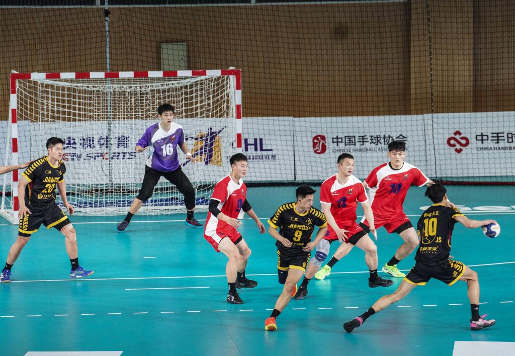 19日,中國男子手球超級聯(lián)賽遷安賽區(qū)江蘇隊(黑)與安徽隊(紅)在比賽中。