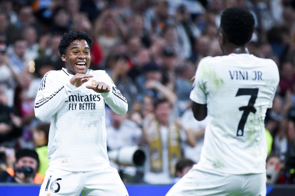 4月1日,皇家馬德里隊(duì)球員恩德里克(左)和維尼修斯在比賽中慶祝進(jìn)球。新華社發(fā)(古斯塔沃·巴連特?cái)z)