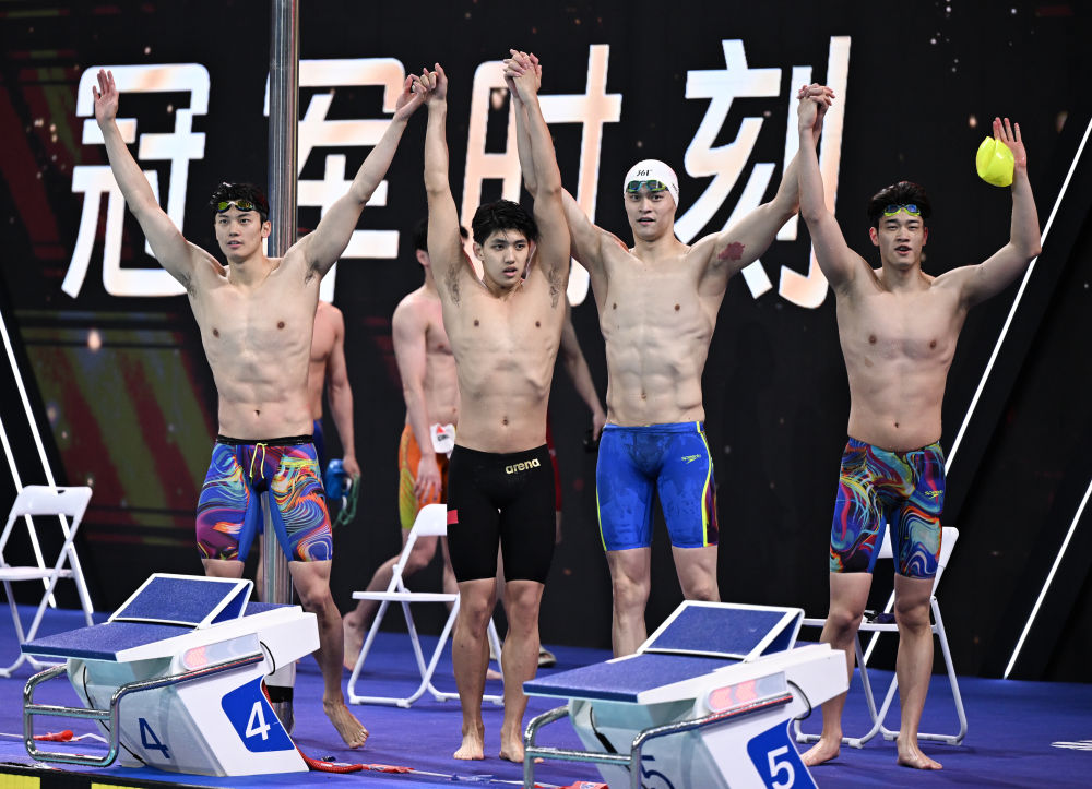 男子4X200米自由泳接力決賽,由汪順、費(fèi)立緯、孫楊和潘展樂組成的浙江隊以7分12秒76的成績奪冠。第一棒汪順為浙江隊建立優(yōu)勢,交接時已超出第二名一個身位,此后費(fèi)立緯繼續(xù)擴(kuò)大領(lǐng)先,孫楊和潘展樂沒有給對手追趕的機(jī)會,浙江隊以領(lǐng)先第二名超過3秒的優(yōu)勢奪冠。山東隊和公安體育協(xié)會隊分列二、三位。