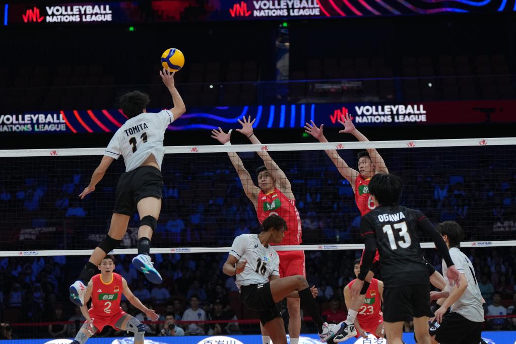 6月11日,中國隊球員李詠臻(上中)、俞元泰在比賽中攔截日本隊球員富田將馬(上左)的扣球。新華社記者 李一博 攝