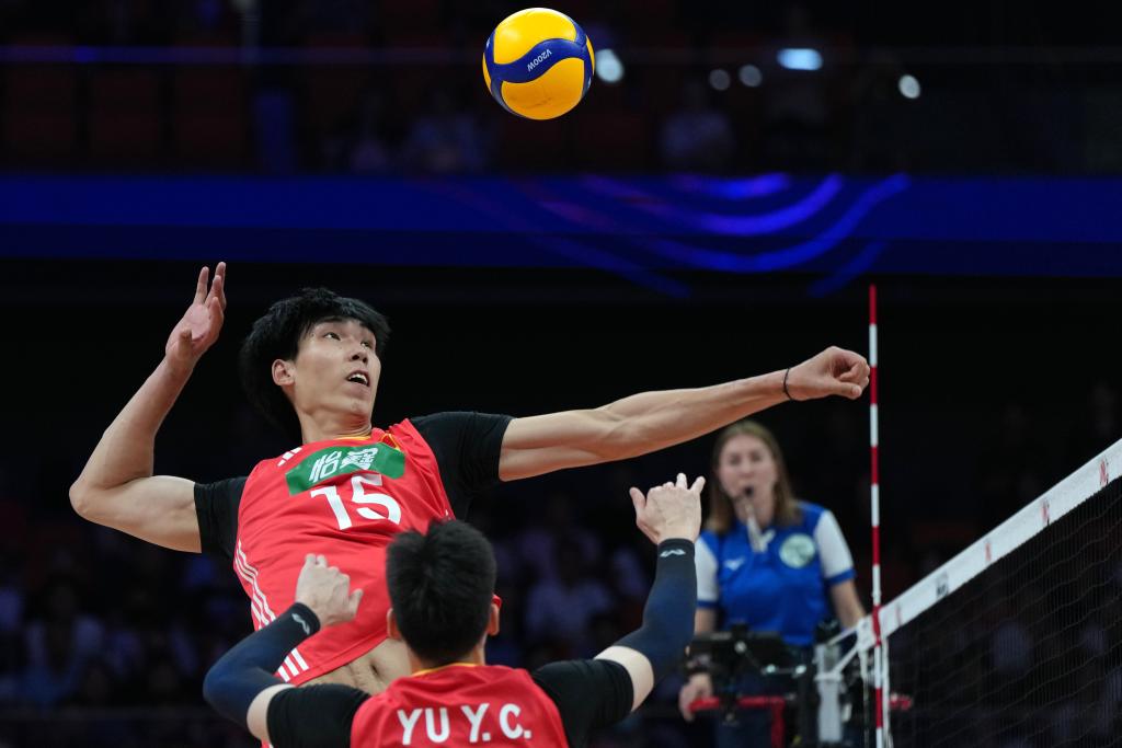 6月11日,中國隊球員彭世坤在比賽中扣球。新華社記者 李一博 攝