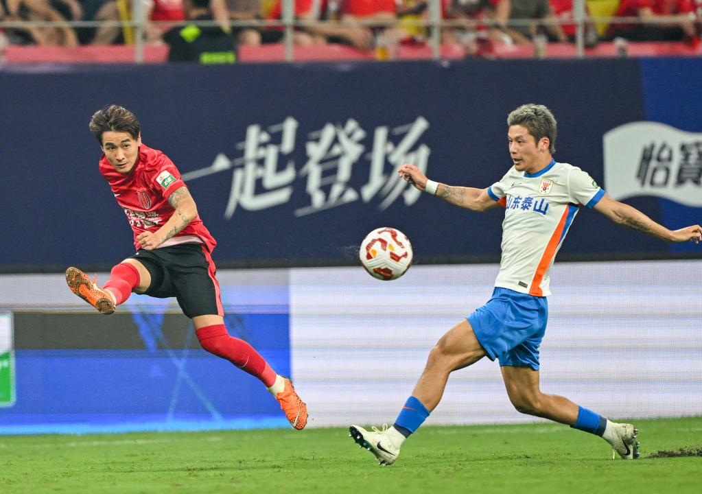8月2日,成都蓉城隊(duì)球員韋世豪(左)在比賽中射門(mén)。新華社發(fā)(尹鋼攝)