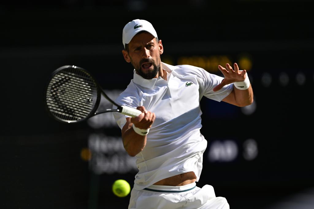 7月11日,焦科維奇在比賽中回球。當日,在英國倫敦舉行的2025溫布爾登網(wǎng)球公開賽男子單打半決賽中,意大利選手辛納3比0戰(zhàn)勝塞爾維亞選手焦科維奇,晉級決賽。新華社記者 趙丁喆 攝