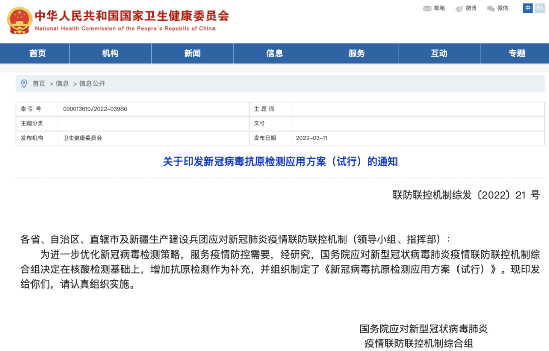 通知指出,為進一步優(yōu)化新冠病毒檢測策略,服務疫情防控需要,經(jīng)研究,國務院應對新型冠狀病毒肺炎疫情聯(lián)防聯(lián)控機制綜合組決定在核酸檢測基礎上,增加抗原檢測作為補充。