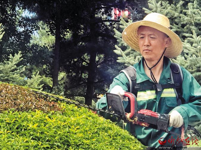 城市是我家,我來扮美它。市園林服務(wù)中心體育廣場管理辦公室張立文正在精心修剪綠植。本報(bào)記者 范 濤 攝