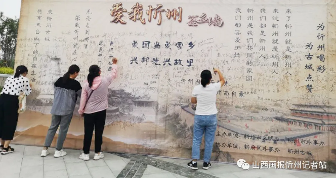 “走遍千山萬水,還是忻州最美”“來了忻州就是忻州人,來過忻州就是忻州人”“愛國當(dāng)愛家鄉(xiāng) 興邦先興故里”……墻上的一句句充滿情感、生動質(zhì)樸的語言,寫滿了對祖國、對家鄉(xiāng)的濃濃熱愛,引起了過往游客路人的深深共鳴。游人們有的在這些文字旁簽名,有的合影留念,有的文思泉涌寫下一條條深情寄語,盡情表達(dá)著對忻州發(fā)展的美好祝福和共建全國文明城市的堅定信心。