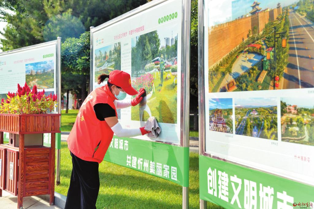 9月9日,市園林服務(wù)中心的志愿者正在忻州城區(qū)體育廣場(chǎng)清潔宣傳欄。眼下正處于創(chuàng)建全國(guó)文明城市的攻堅(jiān)階段,忻州市各單位的志愿者紛紛走上街頭、廣場(chǎng)、小區(qū),為創(chuàng)文助力。 張存良 攝
