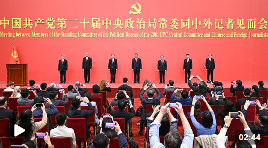 在中國(guó)共產(chǎn)黨第二十屆中央委員會(huì)第一次全體會(huì)議上當(dāng)選的中共中央總書記習(xí)近平和中共中央政治局常委李強(qiáng)、趙樂際、王滬寧、蔡奇、丁薛祥、李希,23日中午在人民大會(huì)堂同采訪中共二十大的中外記者親切見面。