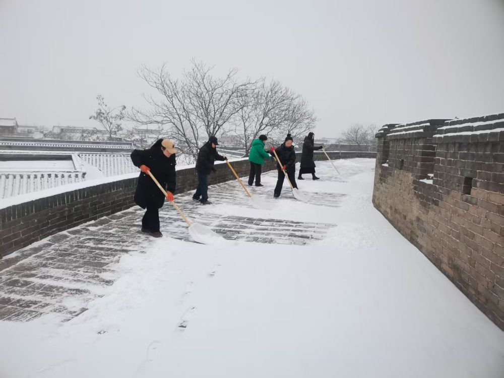 清晨6點,平遙古城的城墻上已是一番忙碌景象。全程6公里多的環(huán)線上,工作人員手持掃帚、鏟子,正細(xì)心地清掃青磚上的積雪。