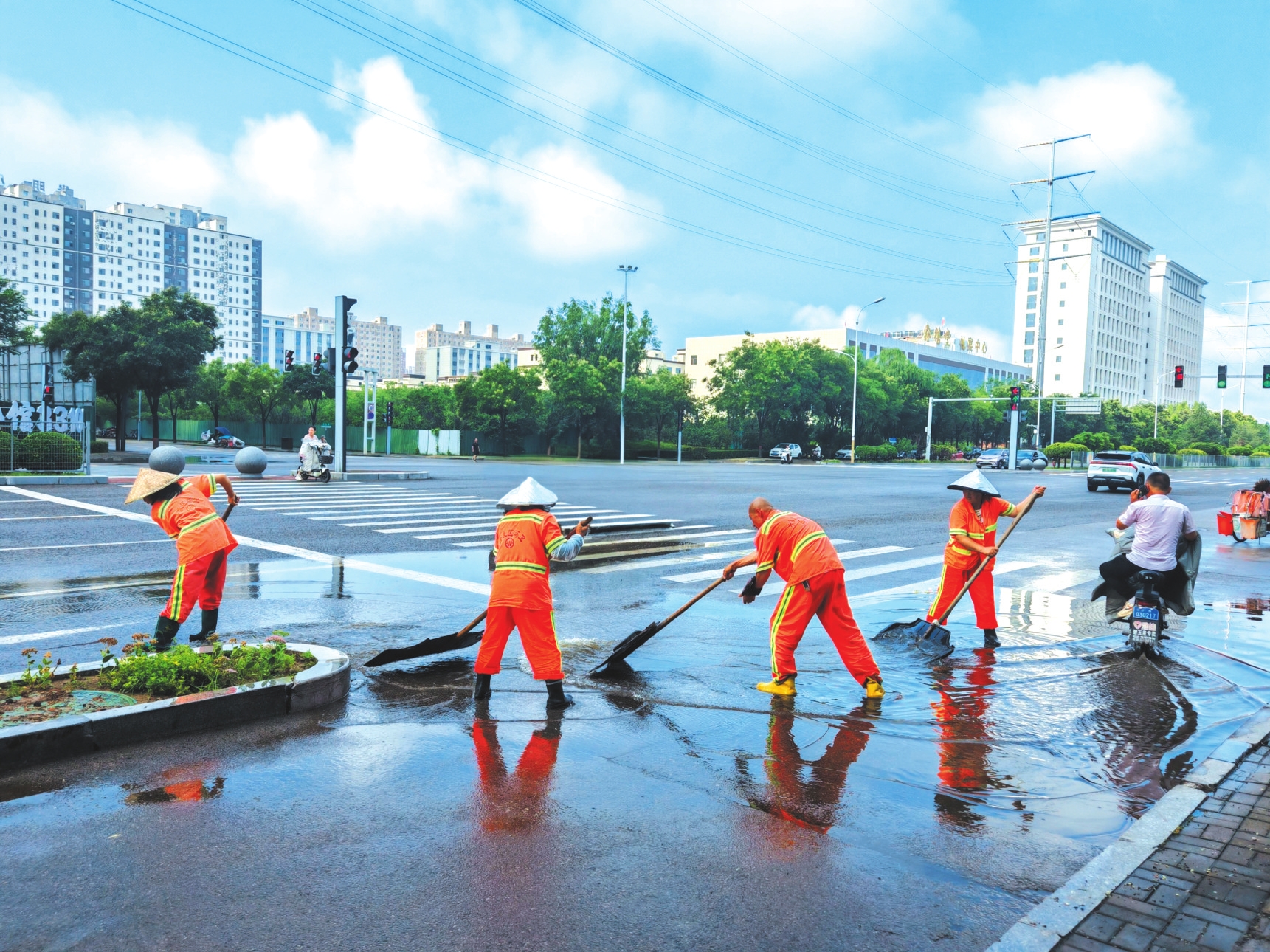 8月5日凌晨,我市降雨天氣造成城區(qū)部分道路路面積水。清晨,環(huán)衛(wèi)工人積極應對雨情,對轄區(qū)內路段開展排水清淤工作,保障市民日常出行。圖為環(huán)衛(wèi)工人在紫檀街路口清理積水。本報記者王陽攝