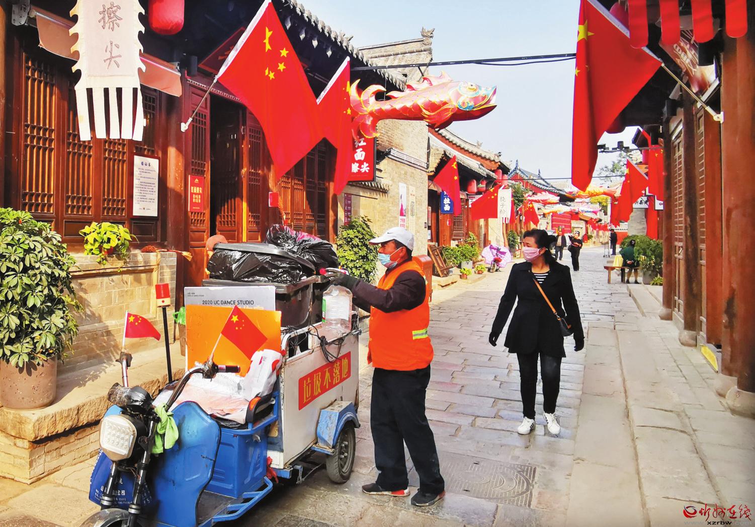 10月14日,忻州古城的環(huán)衛(wèi)工人正在上門(mén)收運(yùn)沿街商戶產(chǎn)生的垃圾,保證日產(chǎn)日清,垃圾不落地。(張存良 攝)