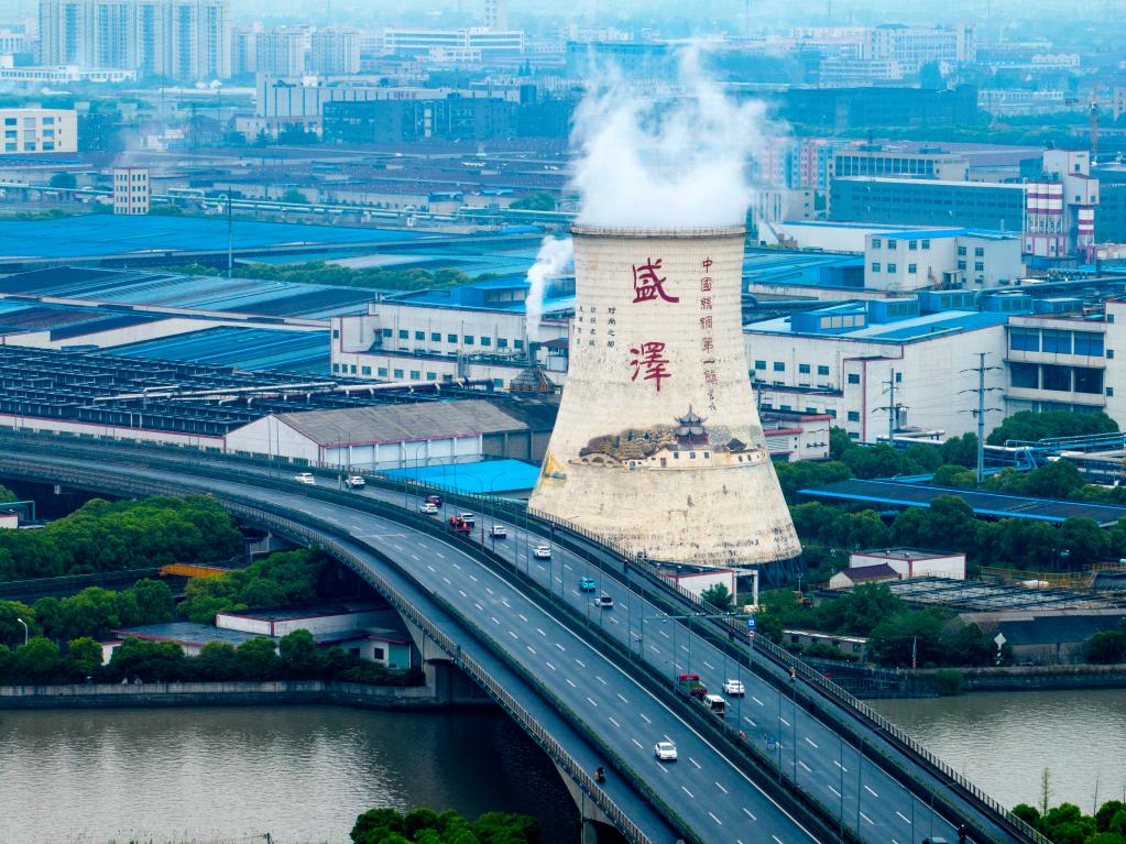 “沒想到一個小鎮(zhèn)就有‘三環(huán)’,早晚高峰還堵車。喲!這里還是‘中國絲綢第一鎮(zhèn)’。”跟隨記者一路調(diào)研的司機師傅說道。順著師傅的示意向窗外眺望,右前方高聳的白色冷卻塔,漸行漸近。塔上“盛澤”二字以及水鄉(xiāng)場景彩繪畫,讓這高55米、底部直徑約48米的冷卻塔,看起來像是一處“文化地標”。