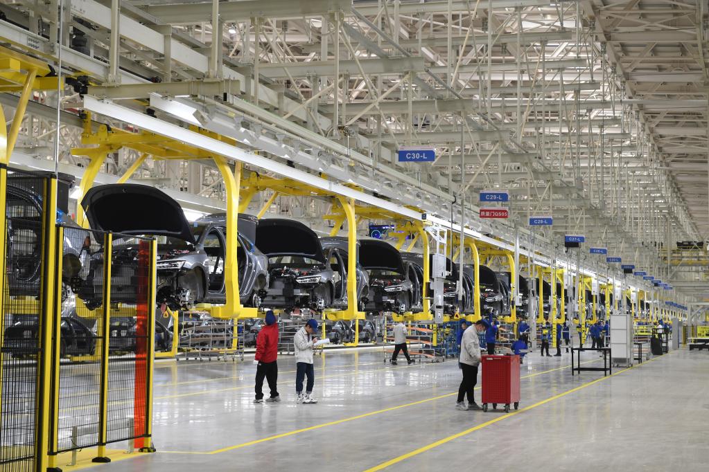 在合肥經(jīng)濟(jì)技術(shù)開發(fā)區(qū)的一家新能源汽車生產(chǎn)企業(yè),工人在整車生產(chǎn)線上作業(yè)。新華社發(fā)(解琛攝)