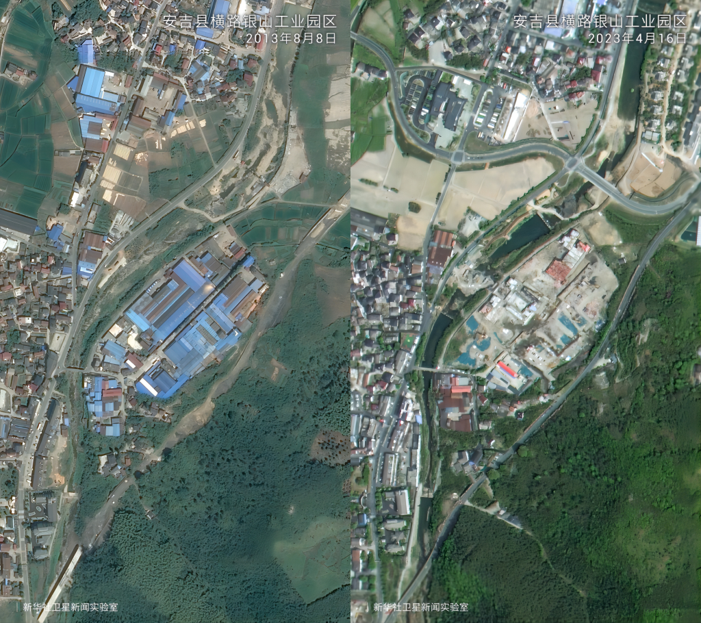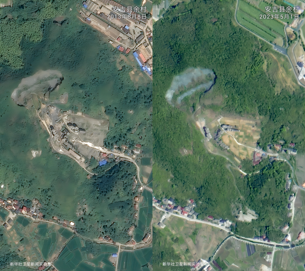 新華社杭州6月26日電 浙江鄉(xiāng)村的美麗蝶變,始于“千村示范、萬村整治”工程。 2003年6月,浙江省委啟動實施“千村示范、萬村整治”工程(以下簡稱“千萬工程”),開啟了以改善農(nóng)村生態(tài)環(huán)境、提高農(nóng)民生活質(zhì)量為核心的村莊整治建設行動。 如今,浙江省九成以上村莊達到新時代美麗鄉(xiāng)村標準;農(nóng)村等級公路比例100%;農(nóng)民收入連續(xù)38年領跑全國省區(qū);城鄉(xiāng)居民收入比從2003年的2.43縮小到2022年的1.90…… 一組組數(shù)據(jù)背后,是浙江各縣市區(qū)對“千萬工程”的生動實踐。這些數(shù)據(jù),透過高空俯瞰更為直觀清晰。一起來看二十年來,衛(wèi)星記錄下的浙江山鄉(xiāng)巨變。 在“綠水青山就是金山銀山”理念指引下,20年來浙江省安吉縣余村完成了從水泥廠、礦山遍布到“人在余村走、就是畫中游”的精彩蝶變。衛(wèi)星云圖中的大片灰色如今已被滿目綠色所覆蓋,從“工業(yè)飛鳥”到“生態(tài)田園”,余村百姓看到了美景,富足了精神。
