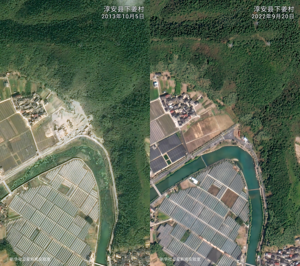 圖說:位于淳安縣楓樹嶺鎮(zhèn)下姜村的楓林港。上世紀90年代初,楓林港的上游建起水電站,但生態(tài)逐漸惡化讓楓林港一度被稱作污水港。從2014年起,淳安對楓林港流域流經(jīng)地實施生活污水處理、綜合治理等工程。近年,淳安縣政府在楓林港全流域推進大規(guī)模綠化造林、封山育林等生態(tài)建設,森林覆蓋率從2001年的26%上升到如今的90%以上。 一組組衛(wèi)星對比圖見證了歲月流轉(zhuǎn)中的鄉(xiāng)村巨變。放眼浙江廣闊大地,這場跨越20年的美麗接力正煥發(fā)新的生機。 策劃:鐘昊熹 袁震宇 統(tǒng)籌:程瑛 翁璟 終審:姜晨 記者:殷曉圣 方問禹 編輯:馬知遙 馬江 郭妍廷 遙感數(shù)據(jù)技術(shù):郭建偉 谷寧 郭超 新華社新媒體中心 媒體融合生產(chǎn)技術(shù)與系統(tǒng)國家重點實驗室 新華社浙江分社 聯(lián)合出品