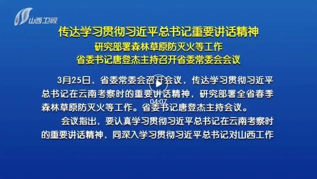 山西日?qǐng)?bào)報(bào)道 3月25日,省委常委會(huì)召開會(huì)議,傳達(dá)學(xué)習(xí)貫徹習(xí)近平總書記在云南考察時(shí)的重要講話精神,研究部署全省春季森林草原防滅火等工作。省委書記唐登杰主持會(huì)議。