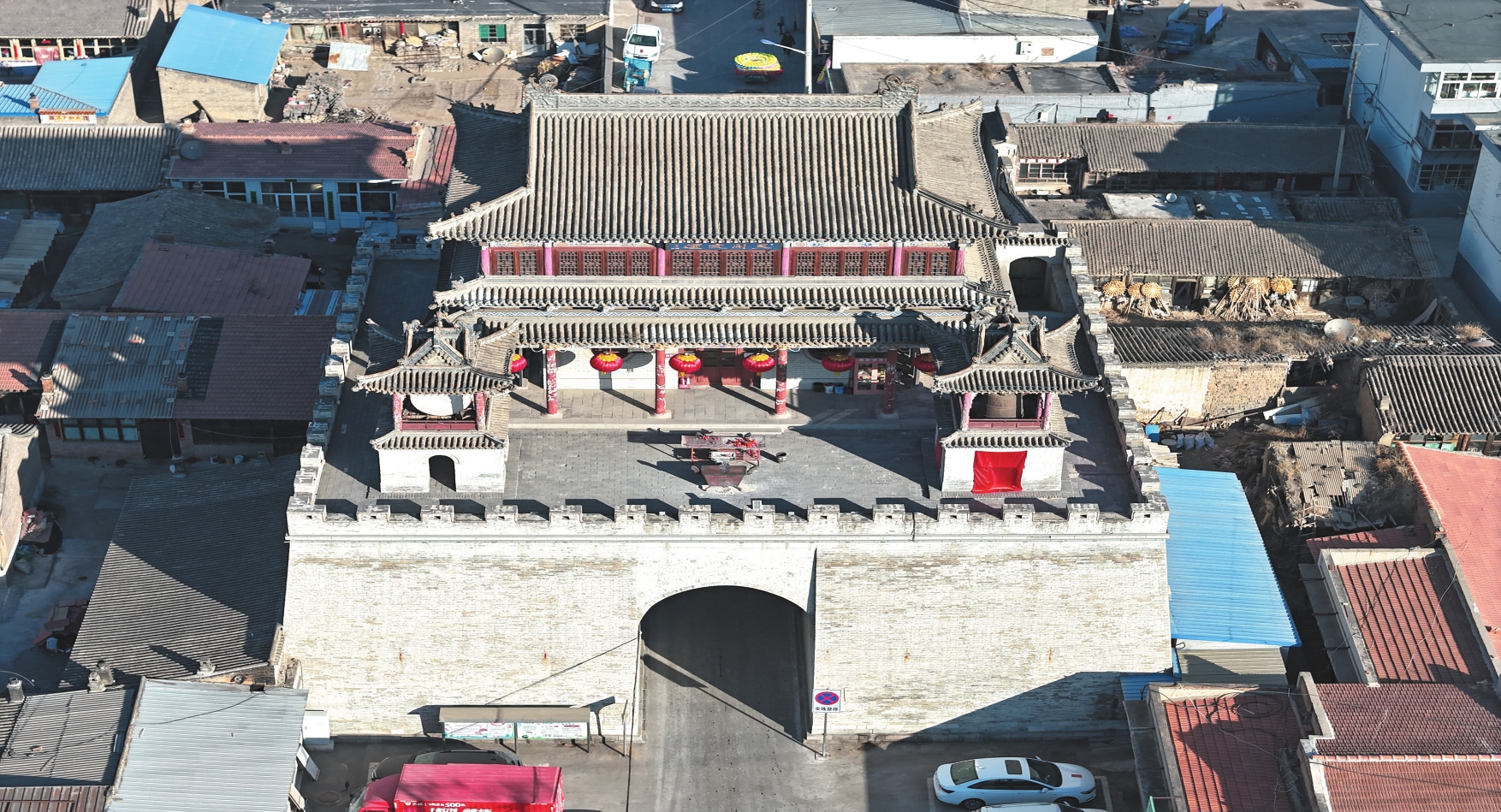繁峙鼓樓位于該縣繁城鎮(zhèn)東城街村鼓樓巷1號,坐北朝南,總高23.22米,占地面積約796.23平方米。城臺(tái)高9.65米、南北長23.79米、東西寬25.24米。馬道南北長22.39米、東西寬3米。城樓南北長9.66米、東西寬14.6米。鐘鼓樓長寬都是3.13米。
