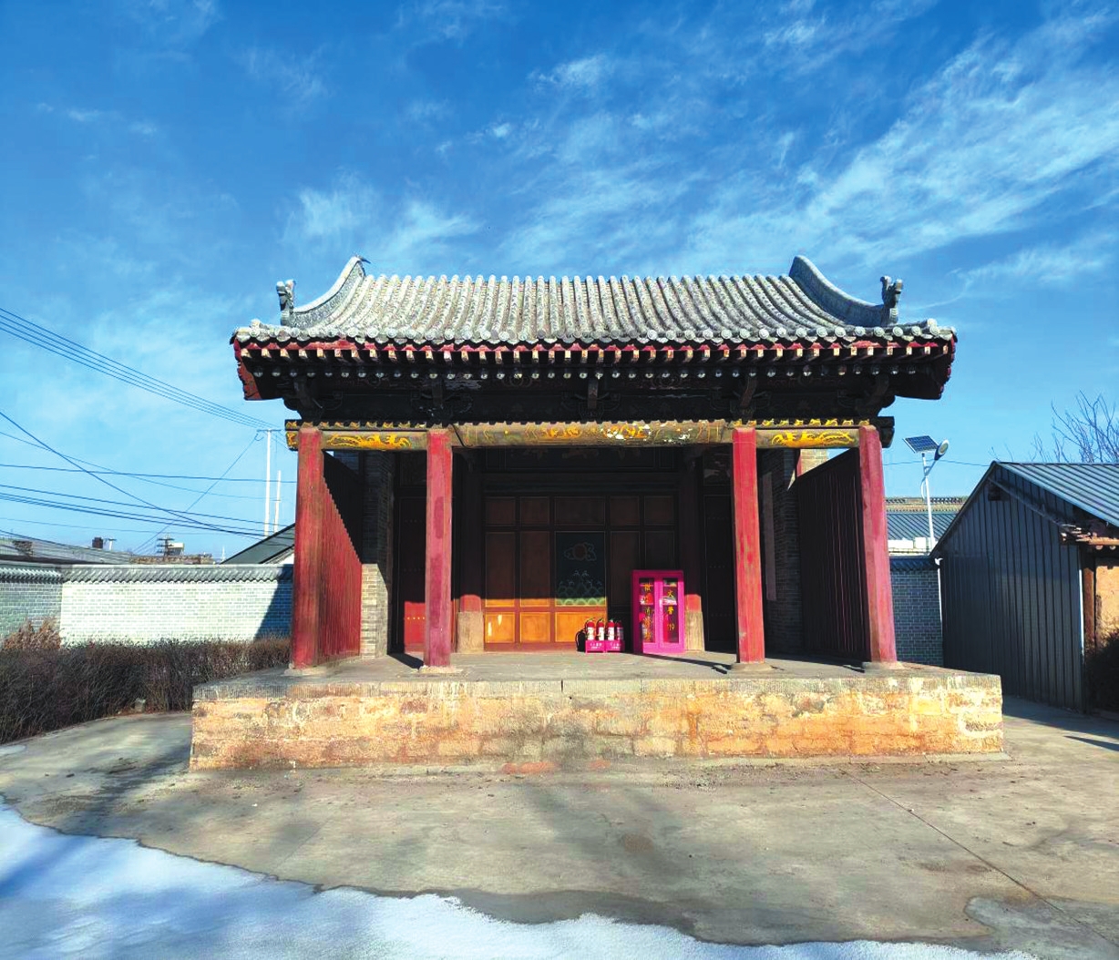 南街戲臺,又名火神廟古戲臺,位于五寨縣城南街南城門口、東七道街,是五寨縣重要的歷史文物遺存。南街戲臺創(chuàng)建于清道光三年(1823年),戲臺坐北朝南,面闊三間,總寬7.5米,樓高2.6米,硬山、博風(fēng)、卷棚式灰瓦布頂,斗拱獸頭為象首形。戲臺進深四椽,前后臺之間設(shè)有隔斷,隔斷上鑲嵌牌匾,上款題“道光癸未”,匾刻“歌且舞”,落款為賈起蛟題。出將、入相轅門上額及墻壁檐柱均有精美彩繪圖案。