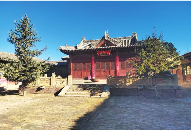一進(jìn)院布局,中軸線現(xiàn)存有正殿1棟,兩側(cè)建有配殿,西北角建有偏殿。正殿磚砌臺(tái)基,面寬五間,進(jìn)深六椽,七檁前后廊式構(gòu)架,前檐斗拱為五踩,后檐為三踩斗拱,單檐懸山頂。前設(shè)月臺(tái),建有抱廈三間,單檐歇山頂?,F(xiàn)新塑像3尊,正殿梁架有彩繪。